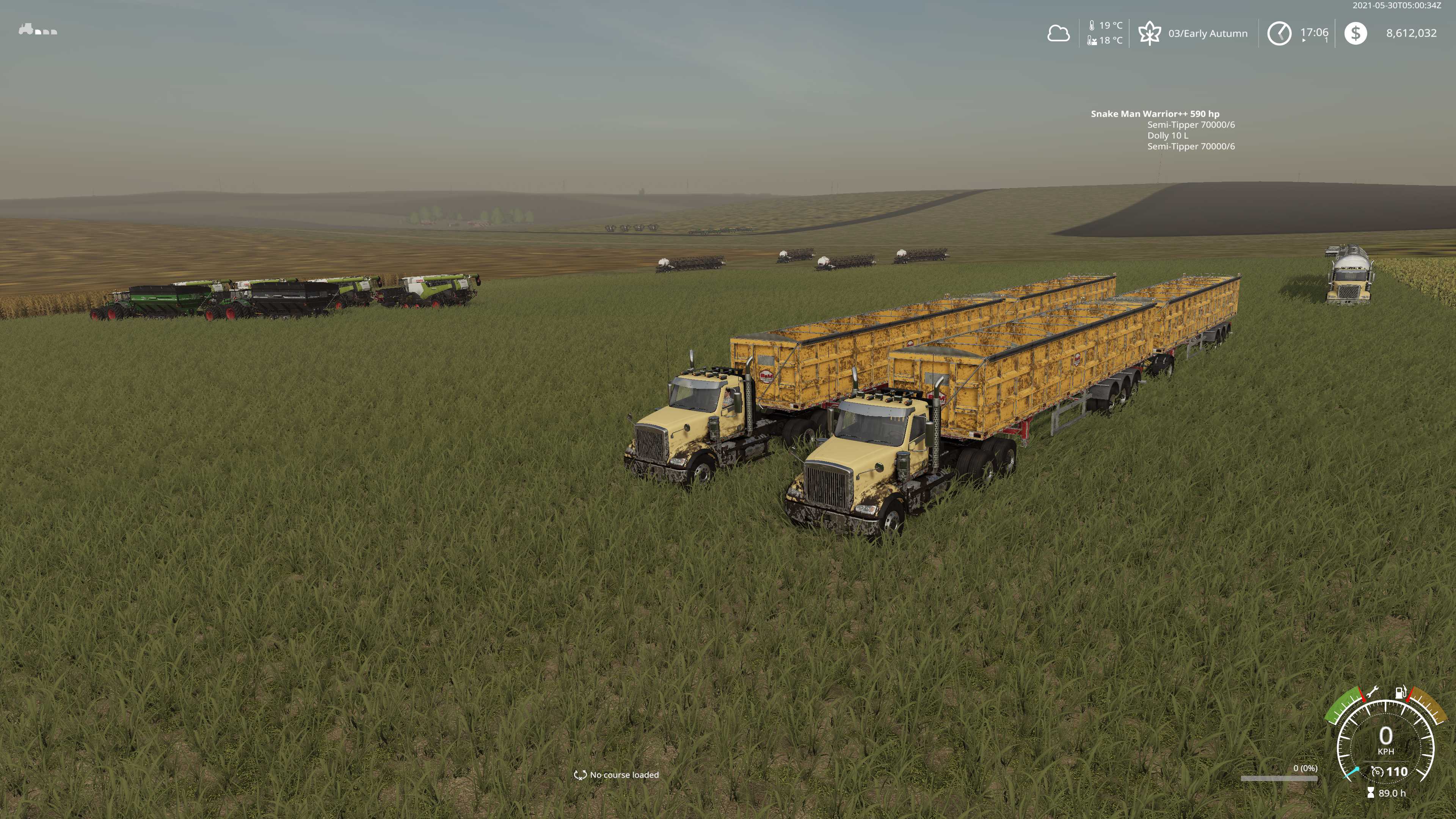 So I relocated harves fleet vehicles to F56 SE corner, then switched grain headers to corn headers for combines and refueled all vehicles. Then recorded semi truck grain hauling courseplay course. Now I was ready to start time accelerating until corn harvest time (corn is now growing stage).