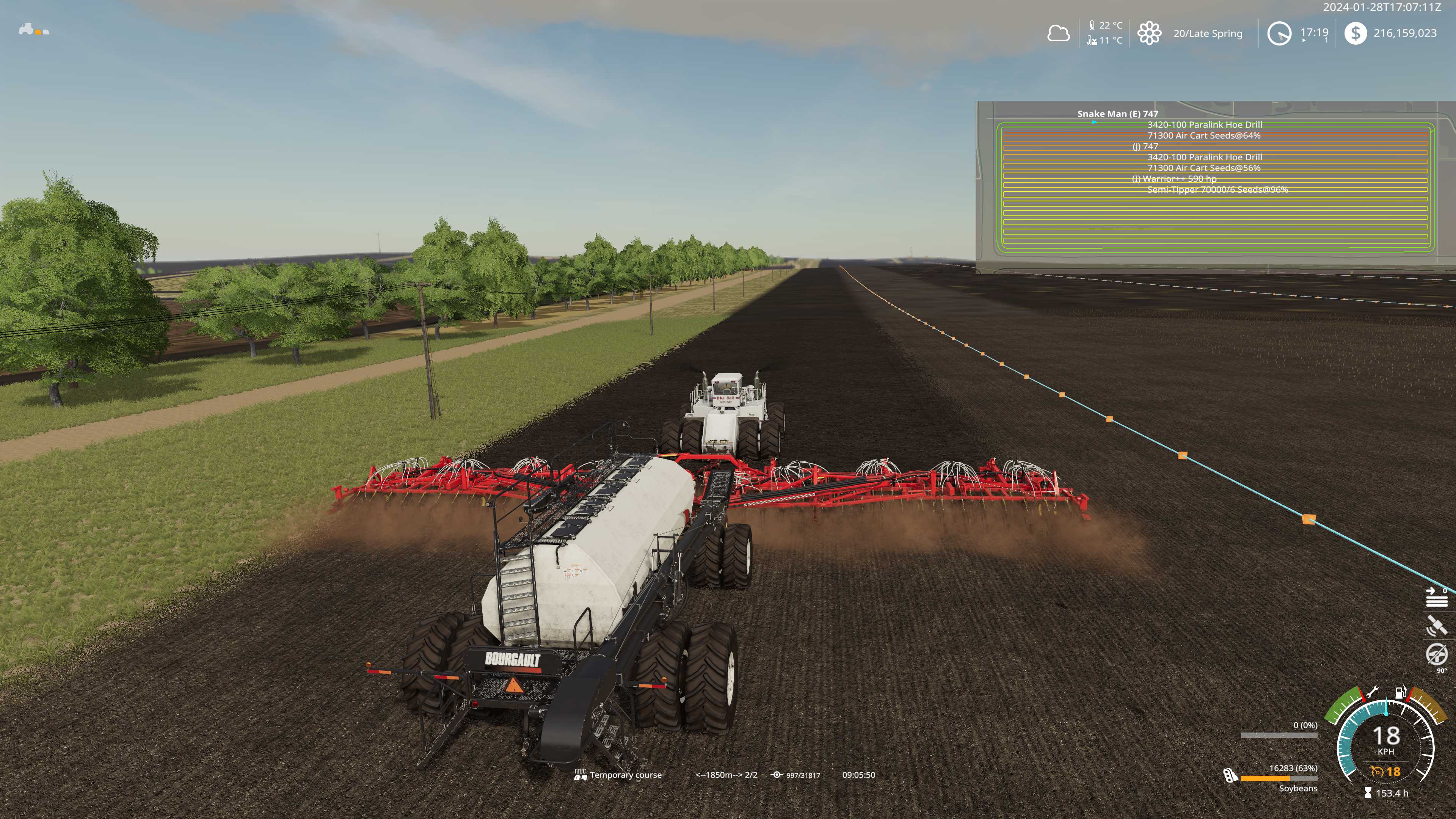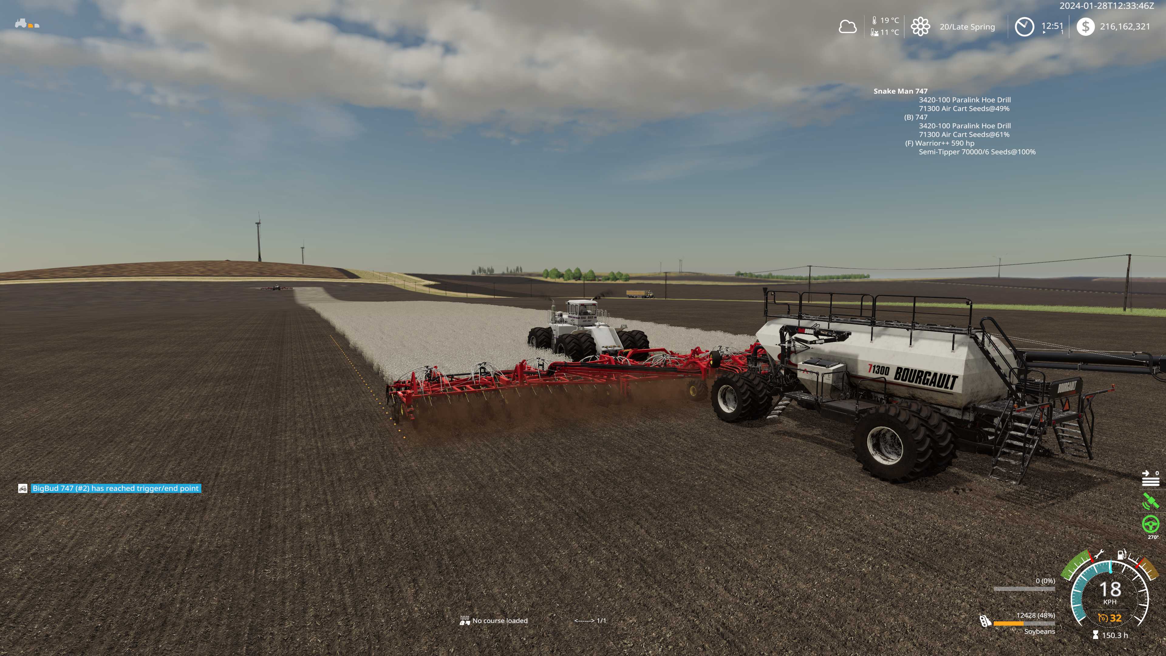 2024-01-28T17:59:54Z Looking over my shoulder I see red courseplay notification, came to check and uh oh second bourgault 71300 air cart has ran out of seeds, yikes!