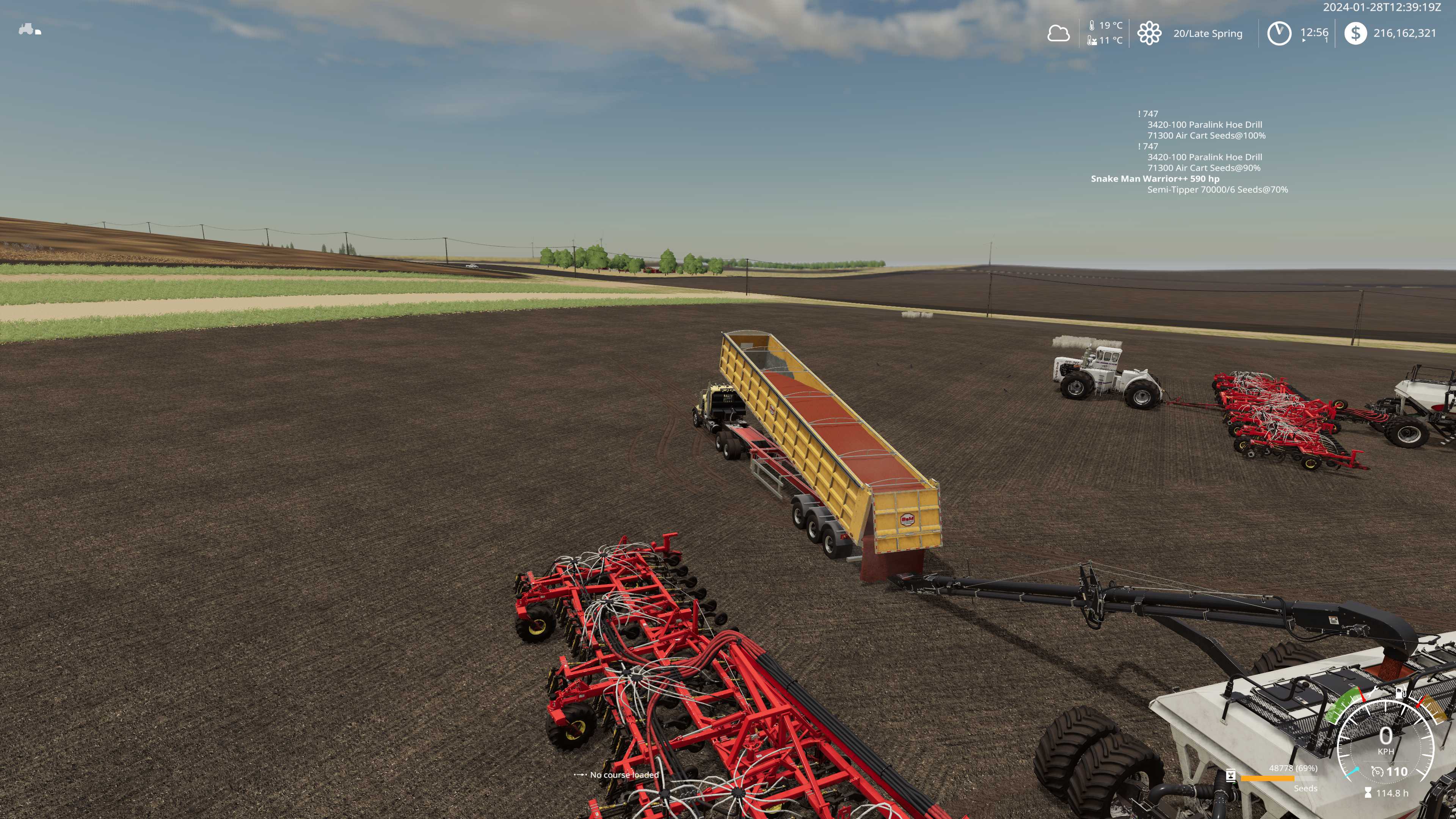 2024-01-28T19:42:50Z Okay switched computers, its almost my lunch break, but first... second bourgault 71300 air cart is out of seeds and first is only 2.9k liters left, guess its time to call up the semi-truck with grain trailer full of seeds.
