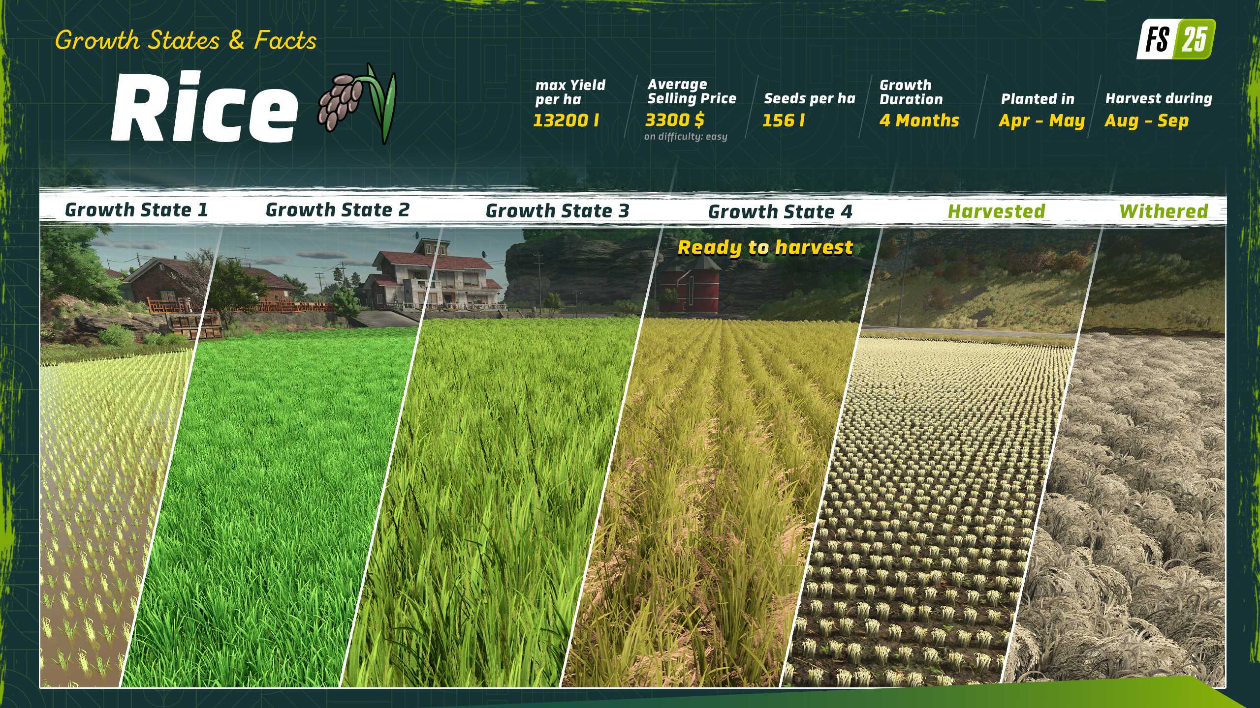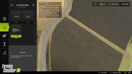 You can grow your own rice saplings in a greenhouse that then is used to seed rice fields / rice paddys. -source youtube the farmsim guy "9 Minutes of Farming Simulator 25 - Raw Gameplay Footage".